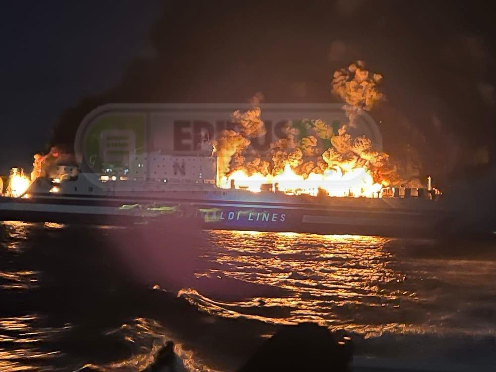 Όπως μετέδωσε το κανάλι του Open, για άγνωστη μέχρι στιγμής αιτία το κατάστρωμα 3 του επιβατηγού-οχηματαγωγού πλοίου Euroferry Olympi που εκτελεί το δρομολόγιο από Ηγουμενίτσα προς Μπρίντεζι με 237 επιβάτες και 51μελές πλήρωμα τυλίχθηκε στις φλόγες με τις εικόνες να είναι σοκαριστικές.