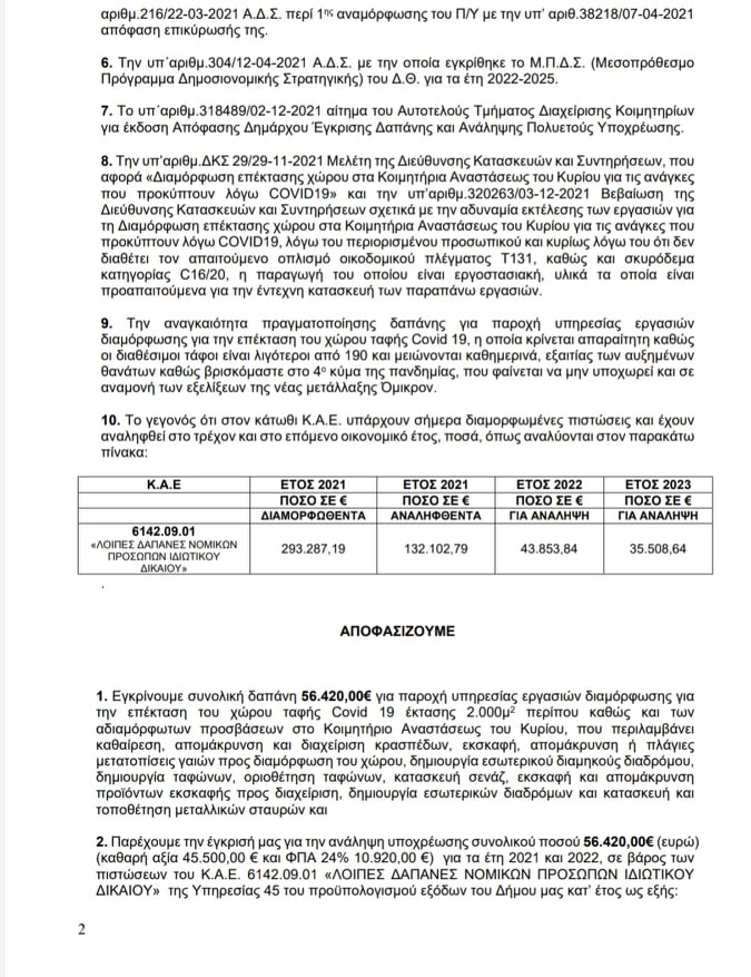 Την αναγκαιότητα πραγματοποίησης δαπάνης για παροχή υπηρεσίας εργασιών διαμόρφωσης για την επέκταση του χώρου ραφής Covid19, η οποία κρίνεται απαραίτητη καθώς οι διαθέσιμοι τάφοι είναι λιγότεροι από 190 και μειώνονται καθημερινά εξαιτίας των αυξημένων θανάτων καθώς βρισκόμαστε στο 4ο κύμα της πανδημίας, που φαίνεται να μην υποχωρεί και σε αναμονή των εξελίξεων της νέας μετάλλαξης Όμικρον».