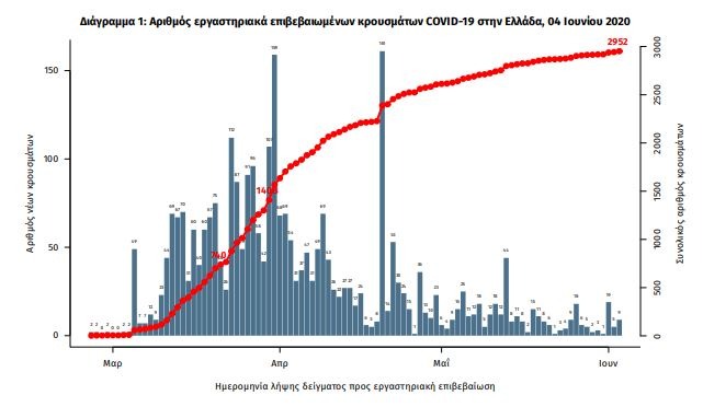 «Τα στοιχεία που παρουσιάζονται αφορούν περιστατικά από την επιδημιολογική επιτήρηση της νόσου από το νέο κορωνοϊό (COVID19), με βάση τα δεδομένα που έχουν δηλωθεί στον ΕΟΔΥ και καταγραφεί μέχρι τις 04 Ιουνίου 2020 (ώρα 15:00).