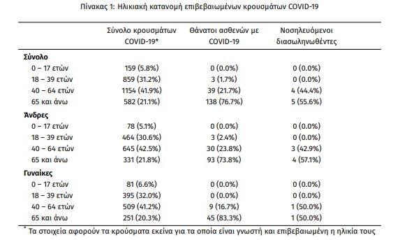 Η μέση ηλικία των κρουσμάτων είναι 48 έτη (εύρος 0 έως 102 ετών), ενώ η μέση ηλικία των θανάτων είναι 77 έτη (εύρος 35 έως 102 ετών). Η ηλικιακή κατανομή των (α) συνολικών κρουσμάτων, (β) των περιστατικών που κατέληξαν σε θάνατο και (γ) των ασθενών που νοσηλεύονται διασωληνωμένοι, είναι η ακόλουθη: