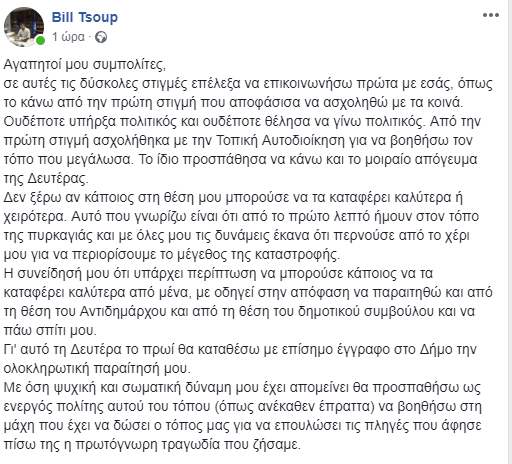 «Η συνείδησή μου ότι υπάρχει περίπτωση να μπορούσε κάποιος να τα καταφέρει καλύτερα από μένα, με οδηγεί στην απόφαση να παραιτηθώ και από τη θέση του Αντιδημάρχου και από τη θέση του δημοτικού συμβούλου και να πάω σπίτι μου».