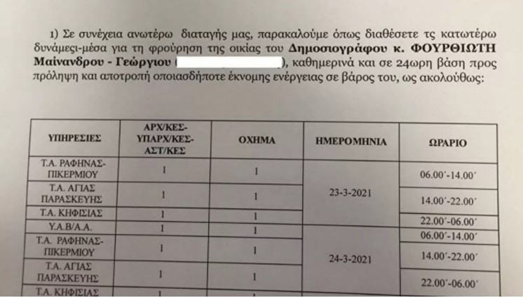 Το ένα από αυτά αναφέρει τις υπηρεσίες που θα διαθέτουν από ένα περιπολικό ανά οκτάωρο την ημέρα, για φρούρηση της οικίας του Μένιου Φουρθιώτη, δηλαδή σταθερή στατική φύλαξη σε αυτό.