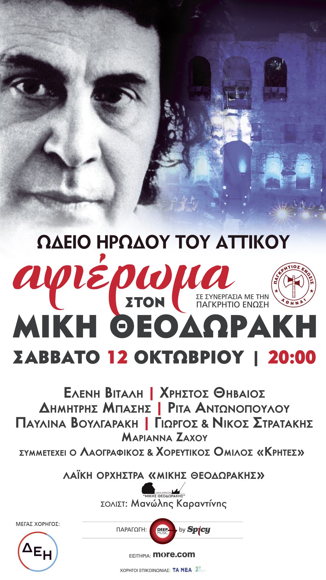 Σημαντικοί καλλιτέχνες τιμούν τον σπουδαίο Μίκη Θεοδωράκη στις 12 Οκτωβρίου και ώρα 20:00 στο Ηρώδειο.
