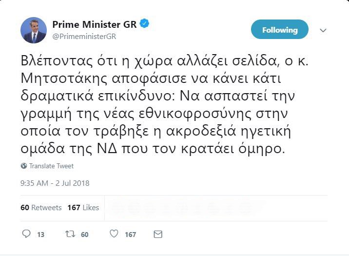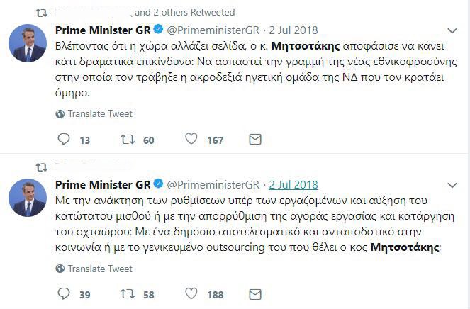 Εκτός όμως της αλλαγής στο Μαξίμου, υπήρξε αλλαγή και στον επίσημο λογαριασμό του Πρωθυπουργού στο twitter. Οι διαχειριστές του λογαριασμού άλλαξαν, όπως έπρεπε, την φωτογραφία. Και ο Κυριάκος Μητσοτάκης πήρε τη θέση του Αλέξη Τσίπρα.