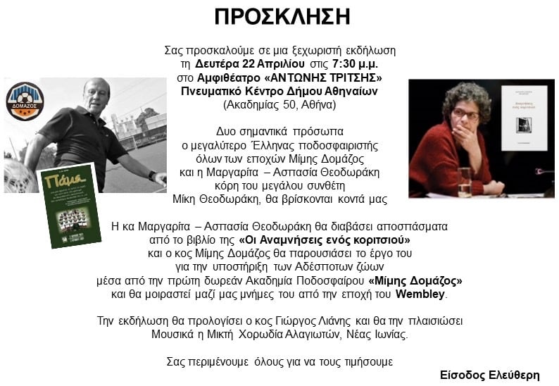 Συγκεκριμένα, δύο πολύ σπουδαία πρόσωπα, ένας από τους μεγαλύτερους ποδοσφαιριστές του ελληνικού ποδοσφαίρου και η κόρη του μεγάλου μουσικοσυνθέτη Μίκη Θεοδωράκη, θα βρίσκονται στις 7:30μ.μ. στο Αμφιθέατρο «Αντώνης Τρίτσης» Πνευματικό Κέντρο Δήμου Αθηναίων.