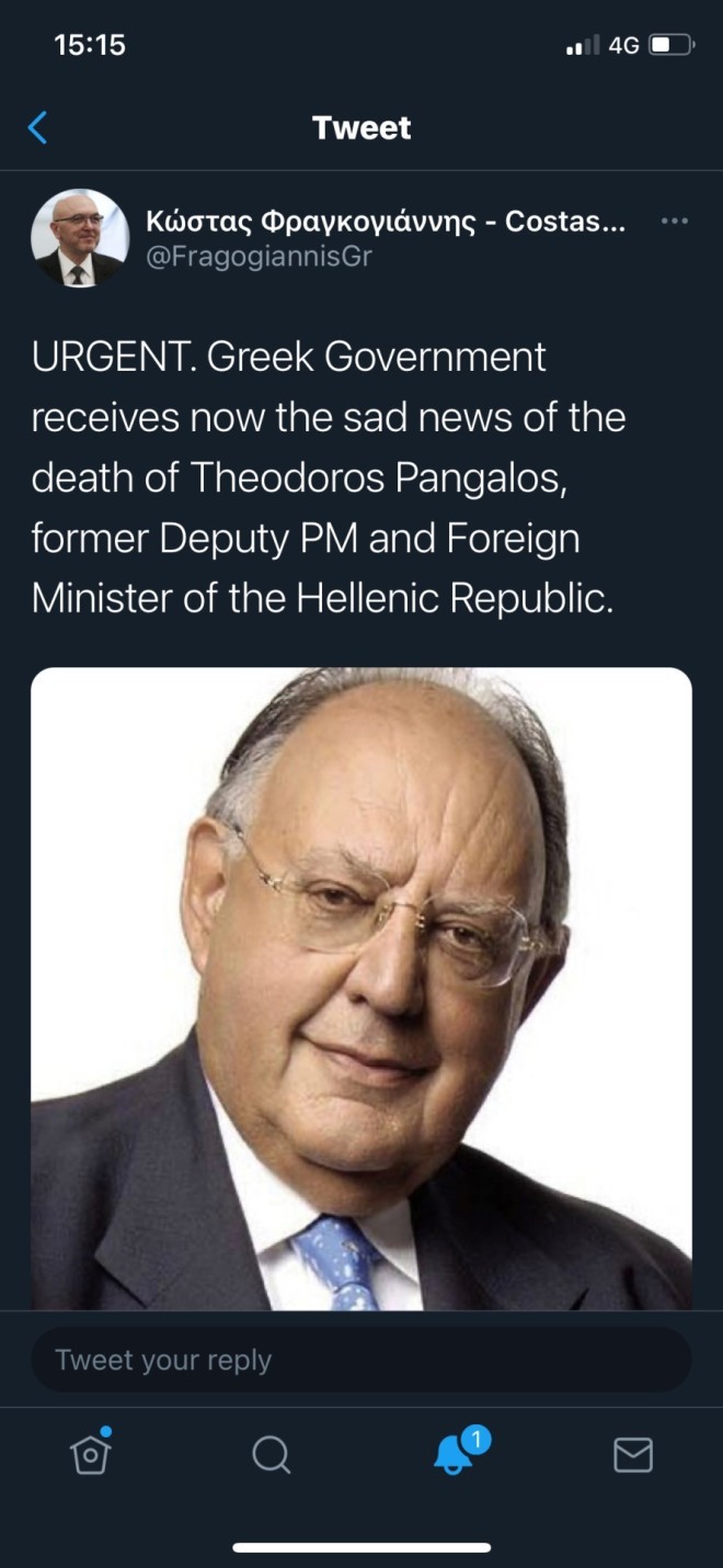 Θεόδωρος Πάγκαλος: Τον «πέθανε» ψεύτικος λογαριασμός του υφυπουργού Εξωτερικών Κώστα Φραγκογιάννη, χαμός στο twitter με το fake news.