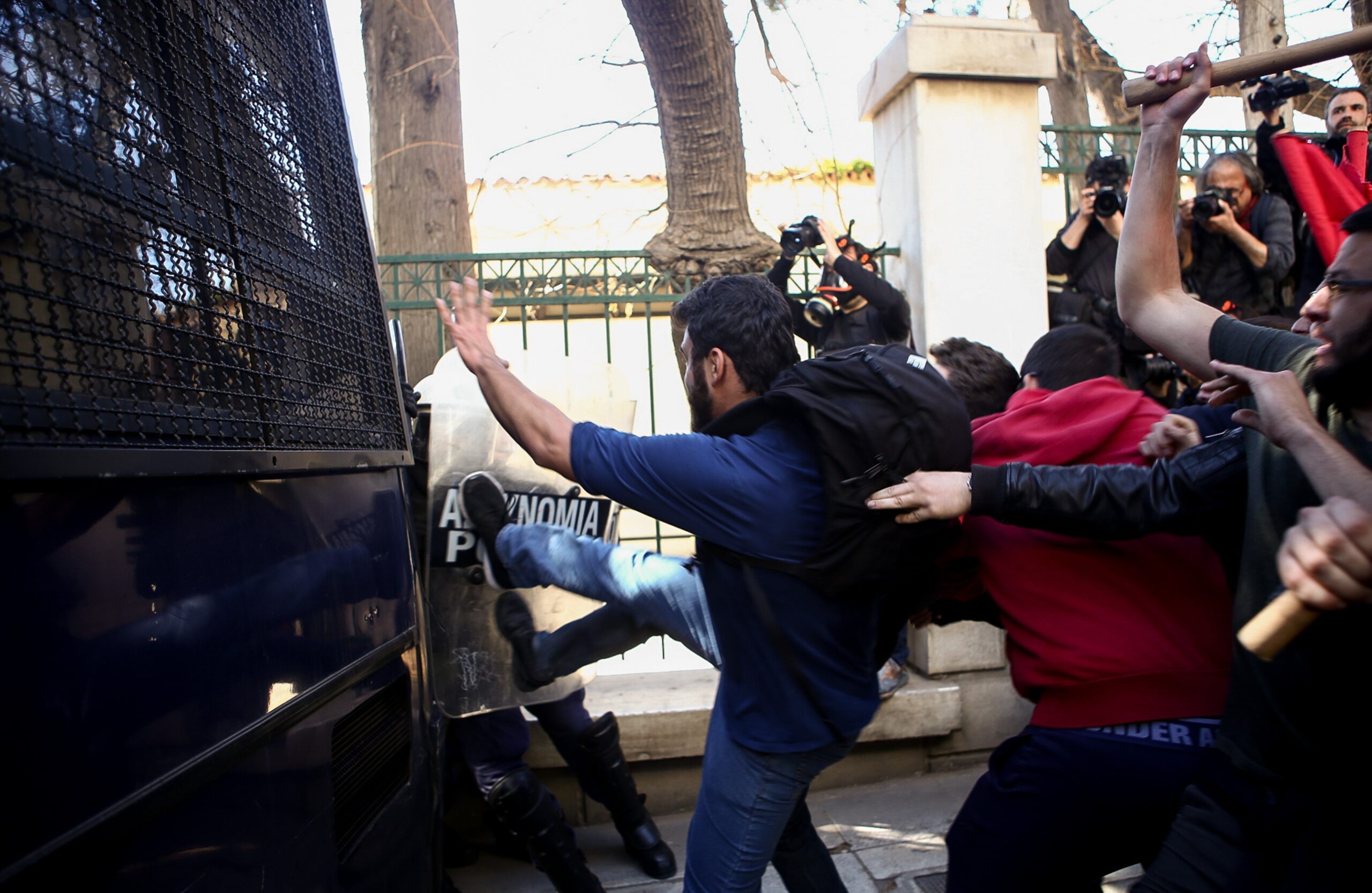 Μια κλούβα των ΜΑΤ βρίσκεται στο σημείο όπου απέτρεψε τους διαδηλωτές από το να πλησιάσουν περισσότερο στο Μέγαρο και έκαναν χρήση δακρυγόνων προκειμένου να διαλύσουν το πλήθος.