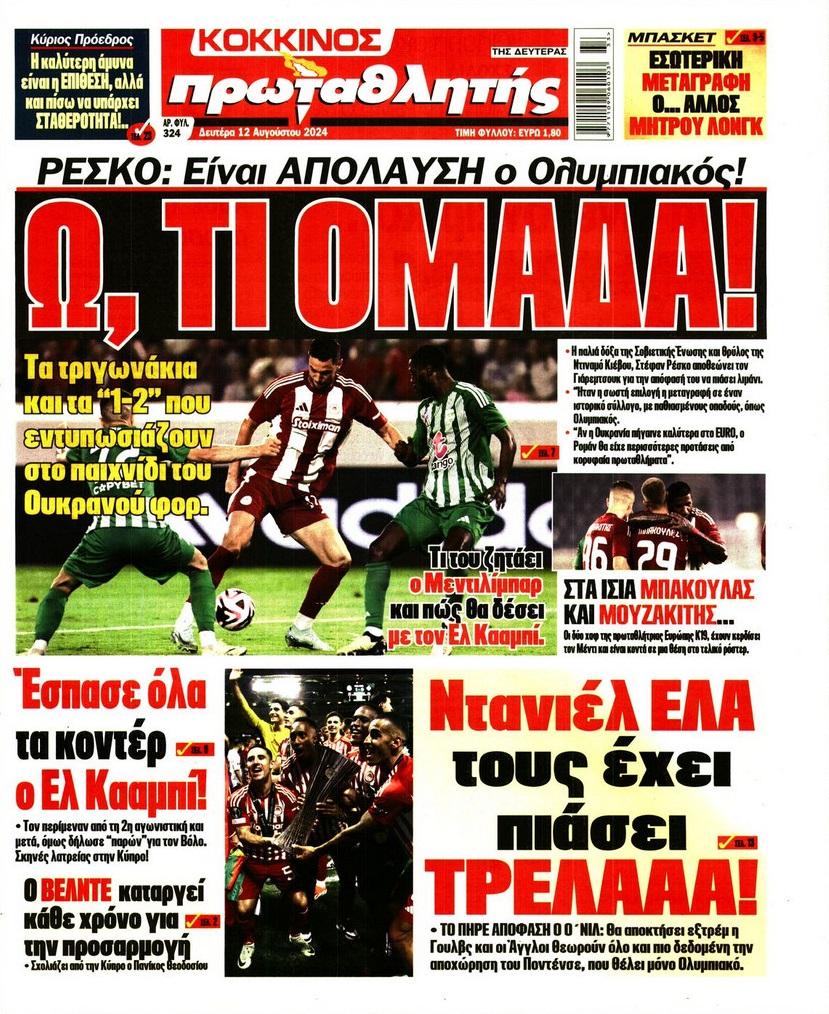 Πρωτοσέλιδα αθλητικών εφημερίδων για την Δευτέρα 12 Αυγούστου 2024