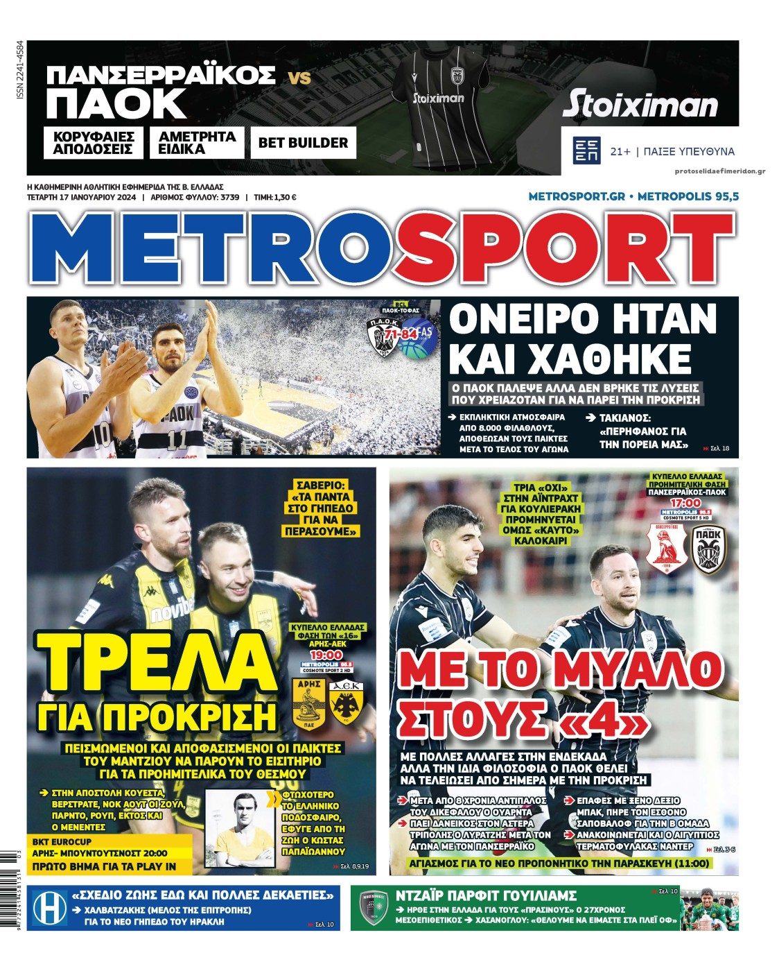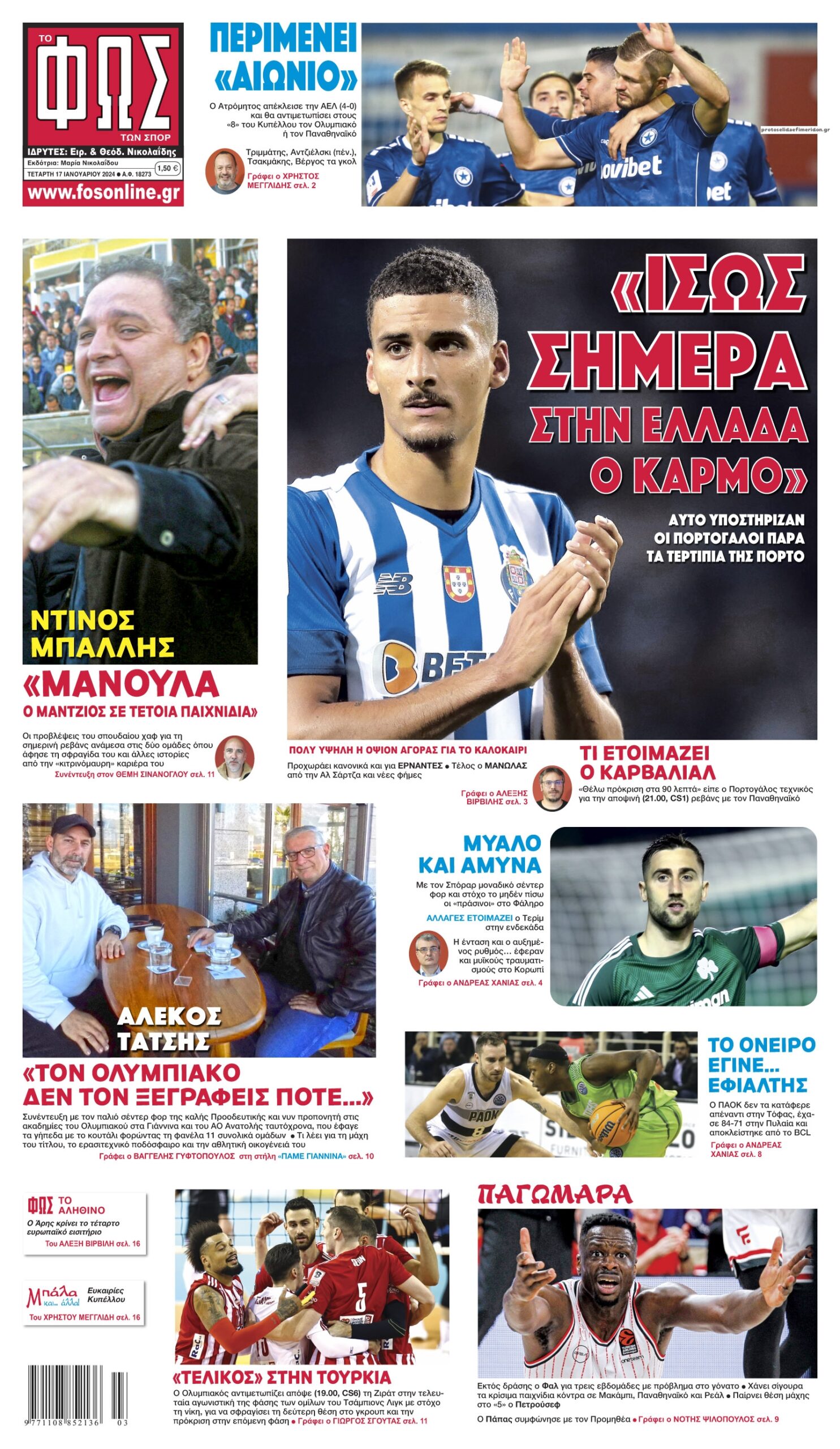 Πρωτοσέλιδα αθλητικών εφημερίδων για την Τετάρτη 17 Ιανουαρίου 2024