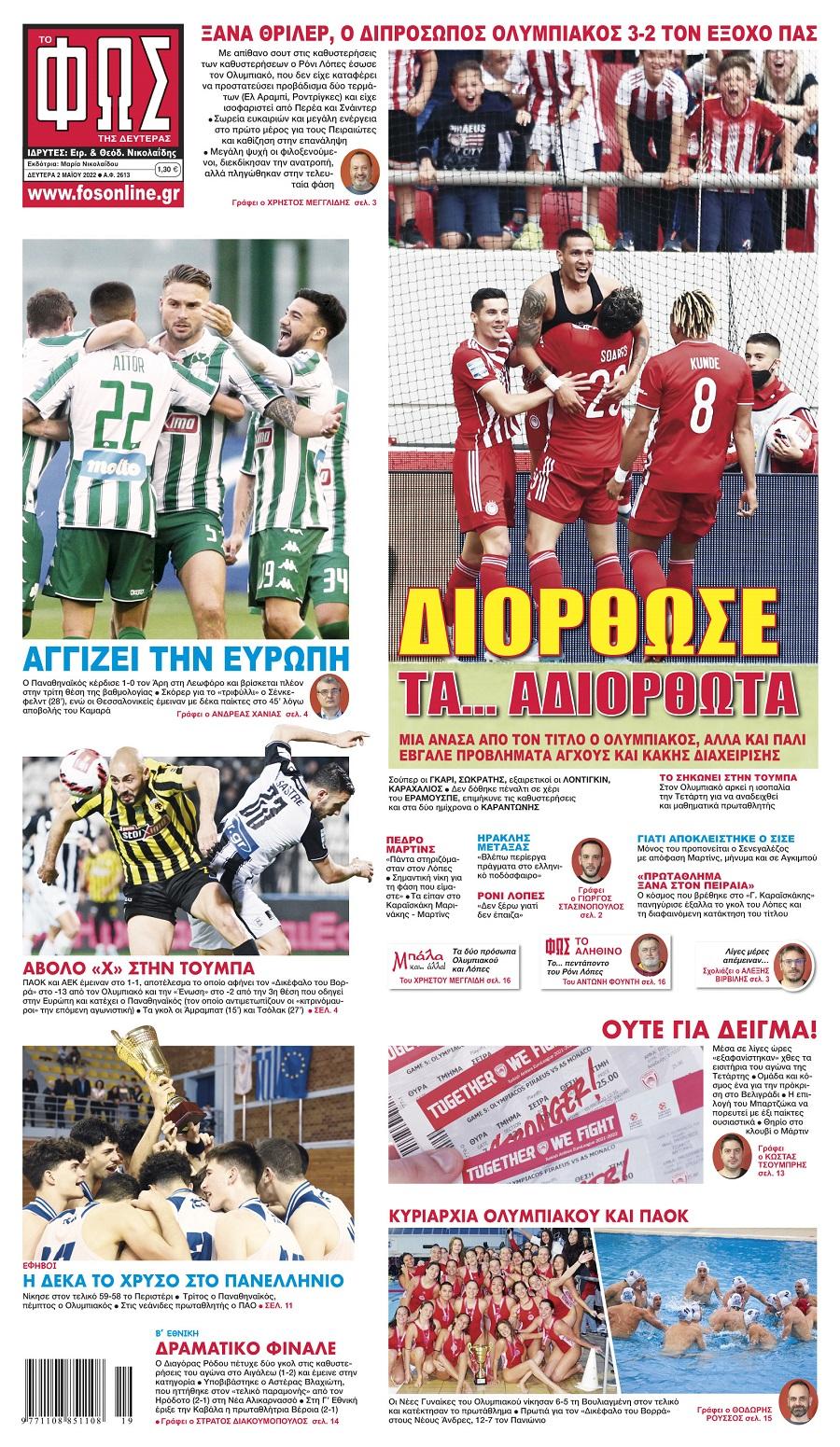 Πρωτοσέλιδα αθλητικών εφημερίδων για τη Δευτέρα 2 Μαΐου 2022. Δείτε αναλυτικά τι αναφέρουν στη… βιτρίνα τους οι εφημερίδες.