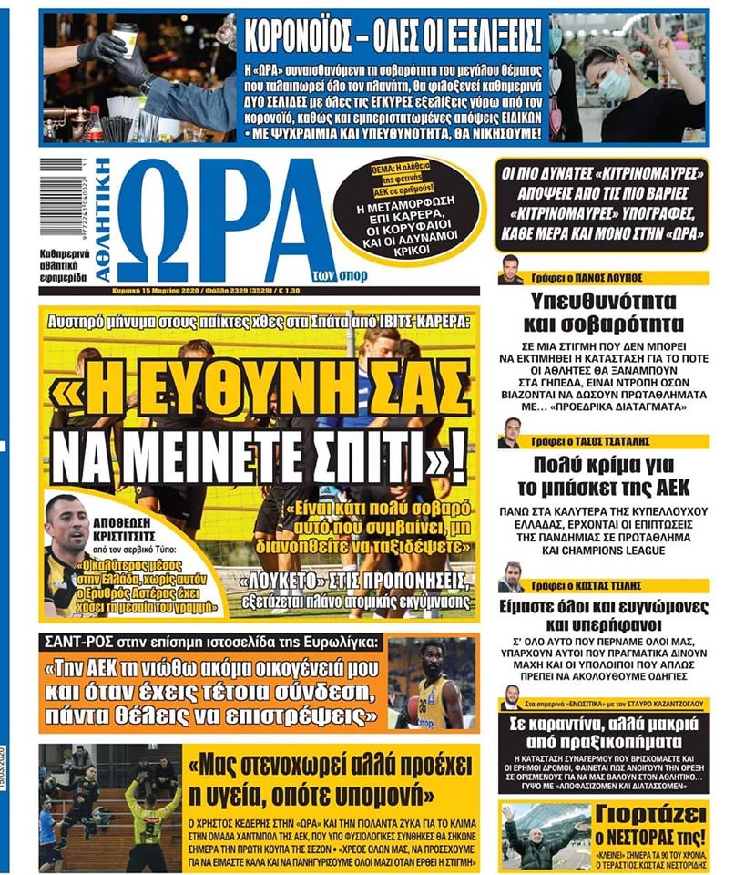 Πρωτοσέλιδα για την Κυριακή 15 Μαρτίου 2020