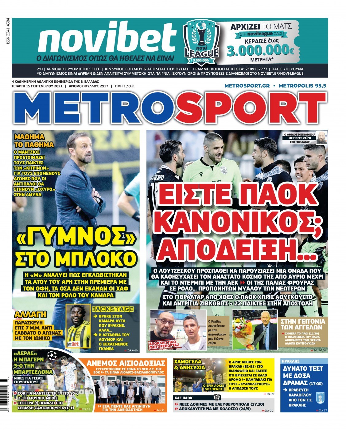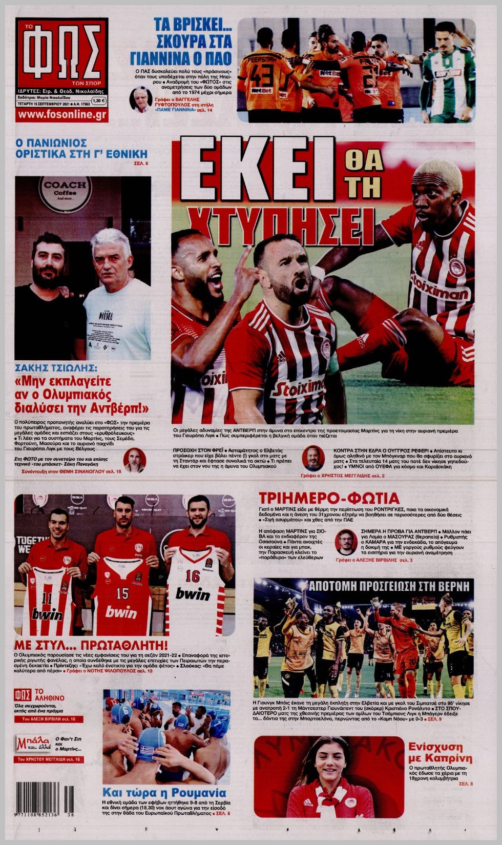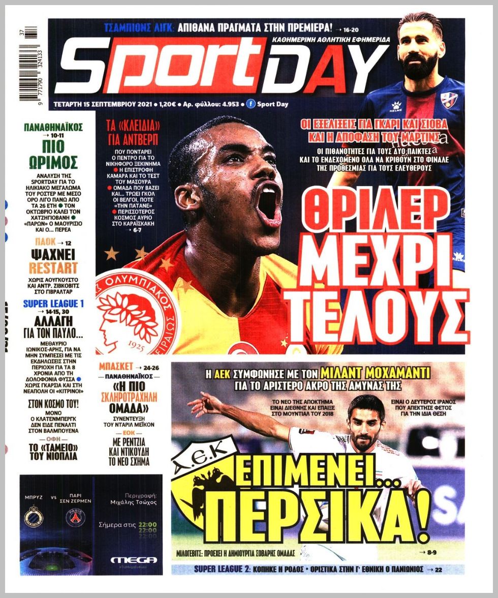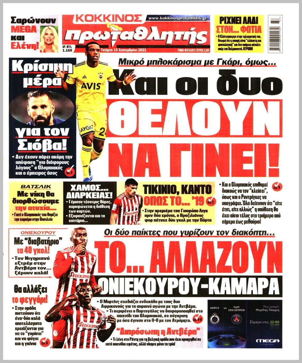 Πρωτοσέλιδα για την Τετάρτη 15 Σεπτεμβρίου 2021. Τι αναφέρουν στη… βιτρίνα τους οι αθλητικές εφημερίδες σε Αθήνα και Θεσσαλονίκη.