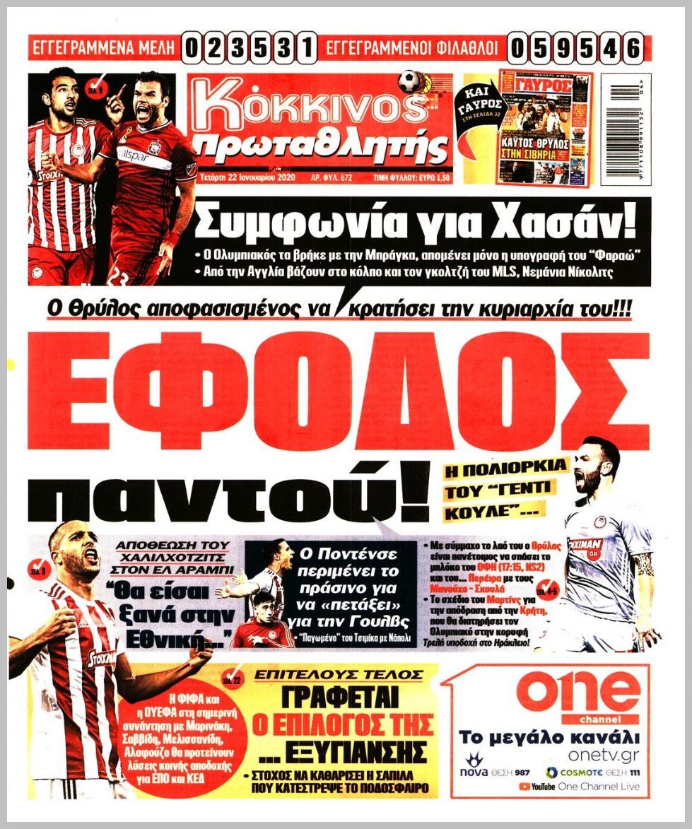 Πρωτοσέλιδα για την Tετάρτη 22 Ιανουαρίου 2020