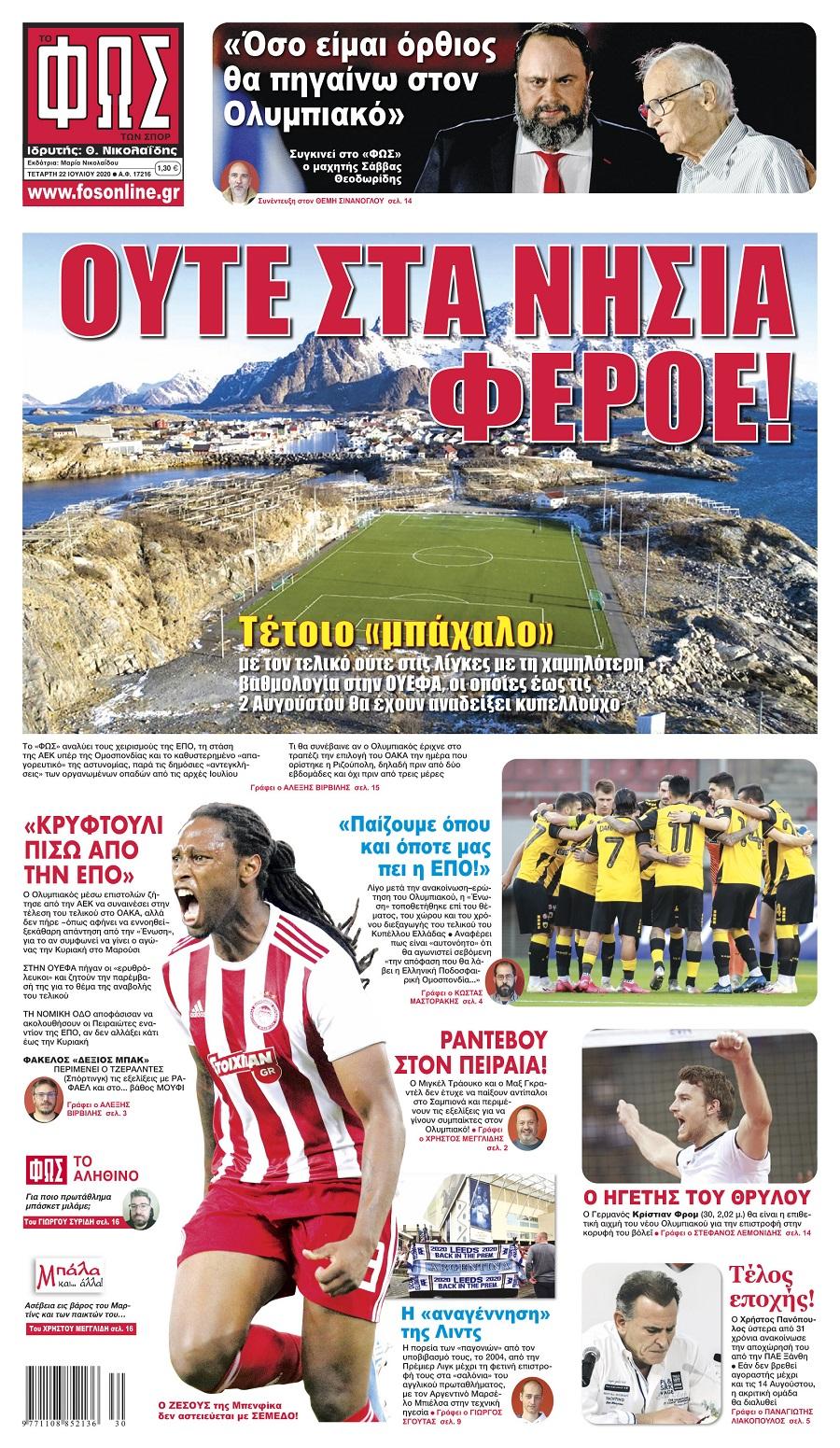 Πρωτοσέλιδα για την Τετάρτη 22 Ιουλίου 2020