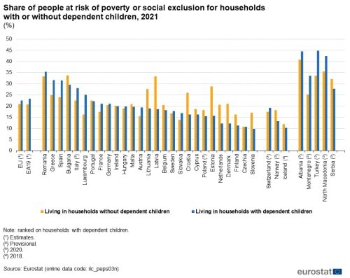Ο μέσος όρος στην Ε.Ε. είναι 21,7%. Τα χαμηλότερα ποσοστά ανθρώπων καταγράφηκαν στην Τσεχία (11%), στη Σλοβενία (13%) και τη Φινλανδία (14%).