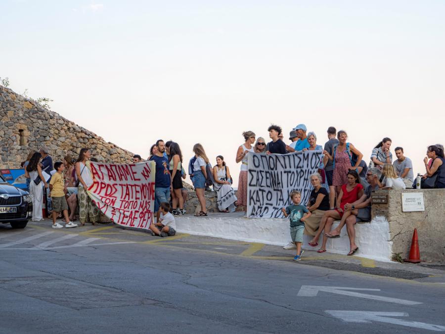 «Ένα σύνθημα που όλους μας ενώνει, κρατήστε το μουσείο, και διώξτε τη Μενδώνη» και «όχι, όχι, στο τελεφερίκ», ακούγονται να φωνάζουν σε σχετικό βίντεο οι κάτοικοι προς την υπουργό Πολιτισμού. Εκείνη στην αρχή συμπεριφέρεται σαν να μη συμβαίνει τίποτα και πραγματοποιεί τις καθιερωμένες χειραψίες με τους ντόπιους παράγοντες, αλλά κατόπιν δεν αντέχει το «τσαλάκωμα» της εικόνας της και κατευθύνεται στο συγκεντρωμένο πλήθος για να ζητήσει το λόγο. Οι αγανακτισμένοι κάτοικοι επιχειρούν να εκφράσουν την αντίθεσή τους στα σχέδια της Μενδώνη κι εκείνη απαντά απαξιωτικά «αυτή είναι η δημοκρατία σας» και απομακρύνεται.