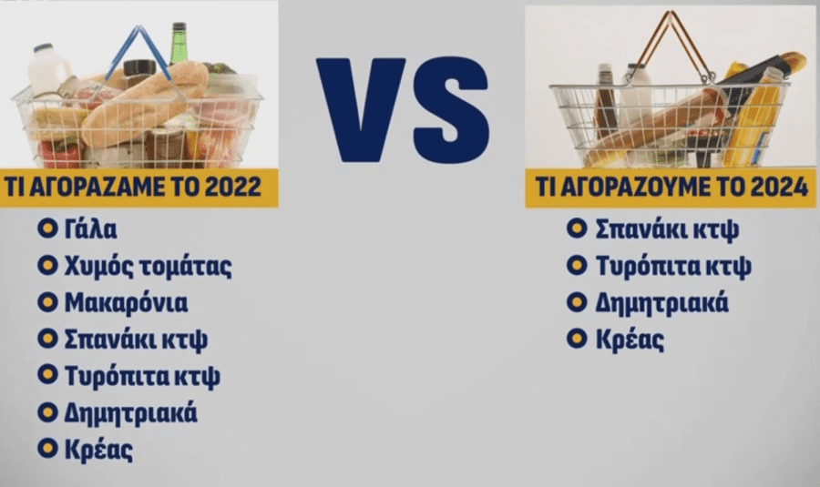 Μιλώντας στο Action 24, έδειξε με σχετικές κάρτες τι αγόραζε μια οικογένεια το 2022 με 25 ευρώ και τι αγοράζει σήμερα το 2024 με 25 ευρώ. Η σύγκριση τιμών έγινε για ίδια προϊόντα, ίδιων εταιρειών, με ίδιες ποσότητες, στο ίδιο σούπερ μάρκετ. Αυτό που διαπιστώθηκε είναι ότι το 2022 ο καταναλωτής μπορούσε να αγοράσει με 25 ευρώ 7 προϊόντα, ενώ σήμερα μόνο 4.