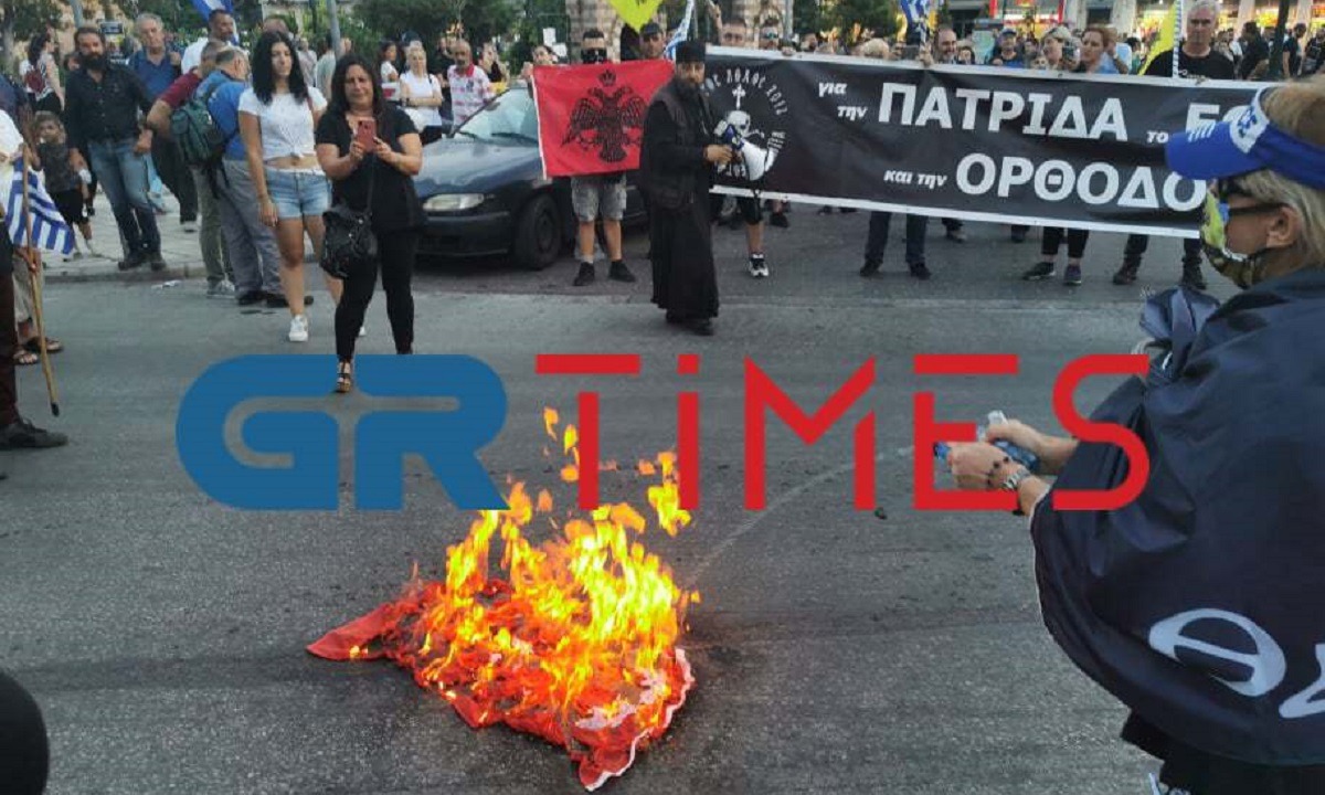 Νωρίτερα, κάποιοι από τους συμμετέχοντες έκαψαν και σημαία της Τουρκίας, ενώ αυτή την ώρα κατευθύνονται προς το Τουρκικό Προξενείο στην οδό Αγίου Δημητρίου στη Θεσσαλονίκη.