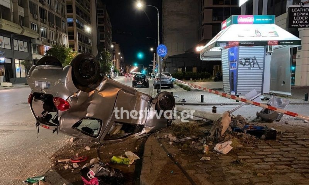 Το αυτοκίνητο βγήκε από την πορεία του και κατέληξε σε κολόνα φωτισμού, αναποδογυρισμένο.