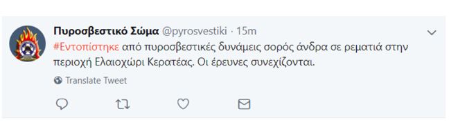 Σύμφωνα με επίσημη ενημέρωση από την πυροσβεστική ο πρώτος άντρας βρέθηκε στον οικισμό Ελαιοχώρι σε ρεματιά, ενώ ο δεύτερος εντοπίστηκε από την πυροσβεστική, σε απόσταση 400 μέτρα, στον οικισμό Διψέλιζα.