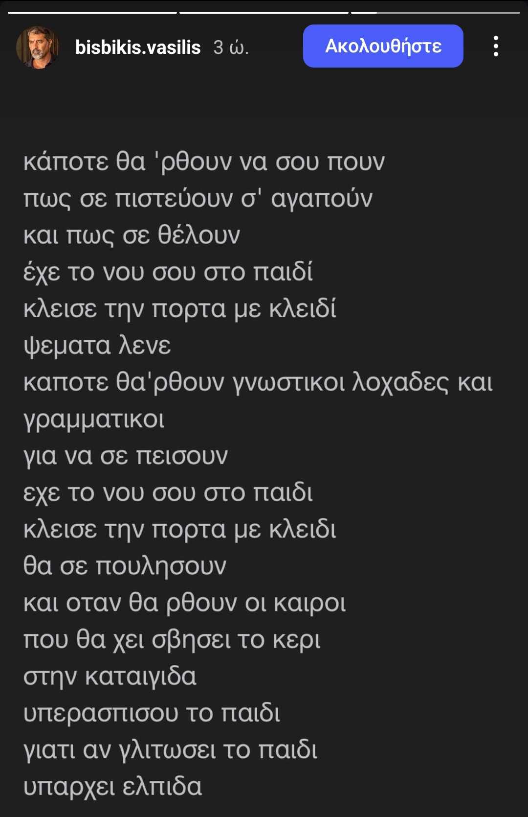 «Έχε το νου σου στο παιδί..», έγραψε ο ηθοποιός ο οποίος στη συνέχεια ανέβασε όλους τους στίχους από το τραγούδι «Κάποτε θα ‘ρθουν» του Παύλου Σιδηρόπουλου το οποίο τονίζει πως «αν γλιτώσει το παιδί υπάρχει ελπίδα».