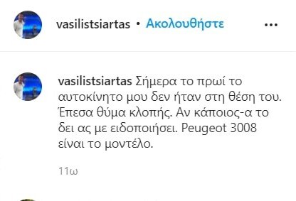 Ο Βασίλης Τσιάρτας ανακοίνωσε στο Instagram πως του έκλεψαν το αυτοκίνητο το πρωί της Τρίτης (26/10).