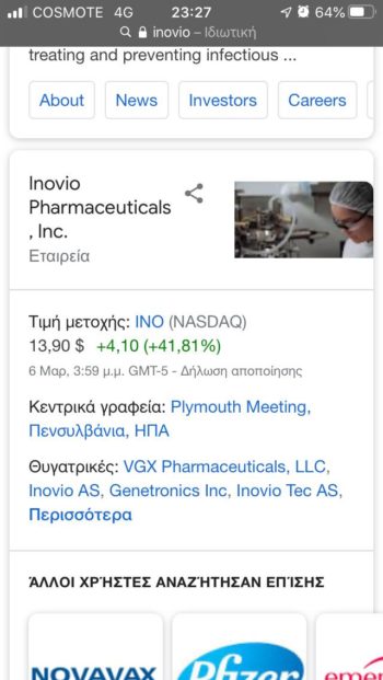 Πρόκειται για την Inovio, η οποία ανακοίνωσε πως θα ξεκινήσει τα εμβόλια στους ανθρώπους από τον Απρίλιο.