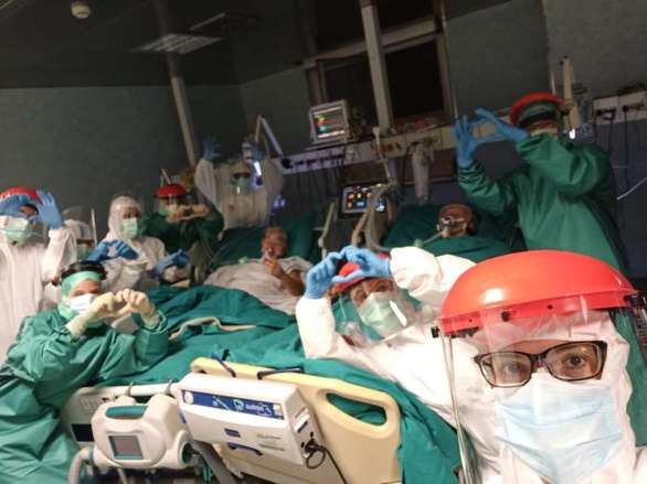 Η 71χρονη Σάντρα και ο σύζυγός της ο 73χρονος Τζιανκάρλο δέχονται οξυγόνο από αναπνευστήρα. Οι νοσοκόμες μετέφεραν τα κρεβάτια τους δίπλα δίπλα ώστε να μπορέσουν να περάσουν την 50ή τους επέτειο μαζί ενώ τους έφεραν και μια μικρή τούρτα με ένα κερί με τον αριθμό 50.