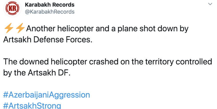 Νωρίτερα είχε γίνει γνωστή η… εκδίκηση των Αρμενίων. Σύμφωνα με ανακοίνωση του Γερεβάν, οι δυνάμεις άμυνας Artsakh κατέρριψαν ένα ελικόπτερο του Αζερμπαϊτζάν, κοντά στην περιοχή Varazatumb (Lele Tepe). Το συντρίμμια του ελικοπτέρου έπεσαν στο έδαφος του Ιράν.