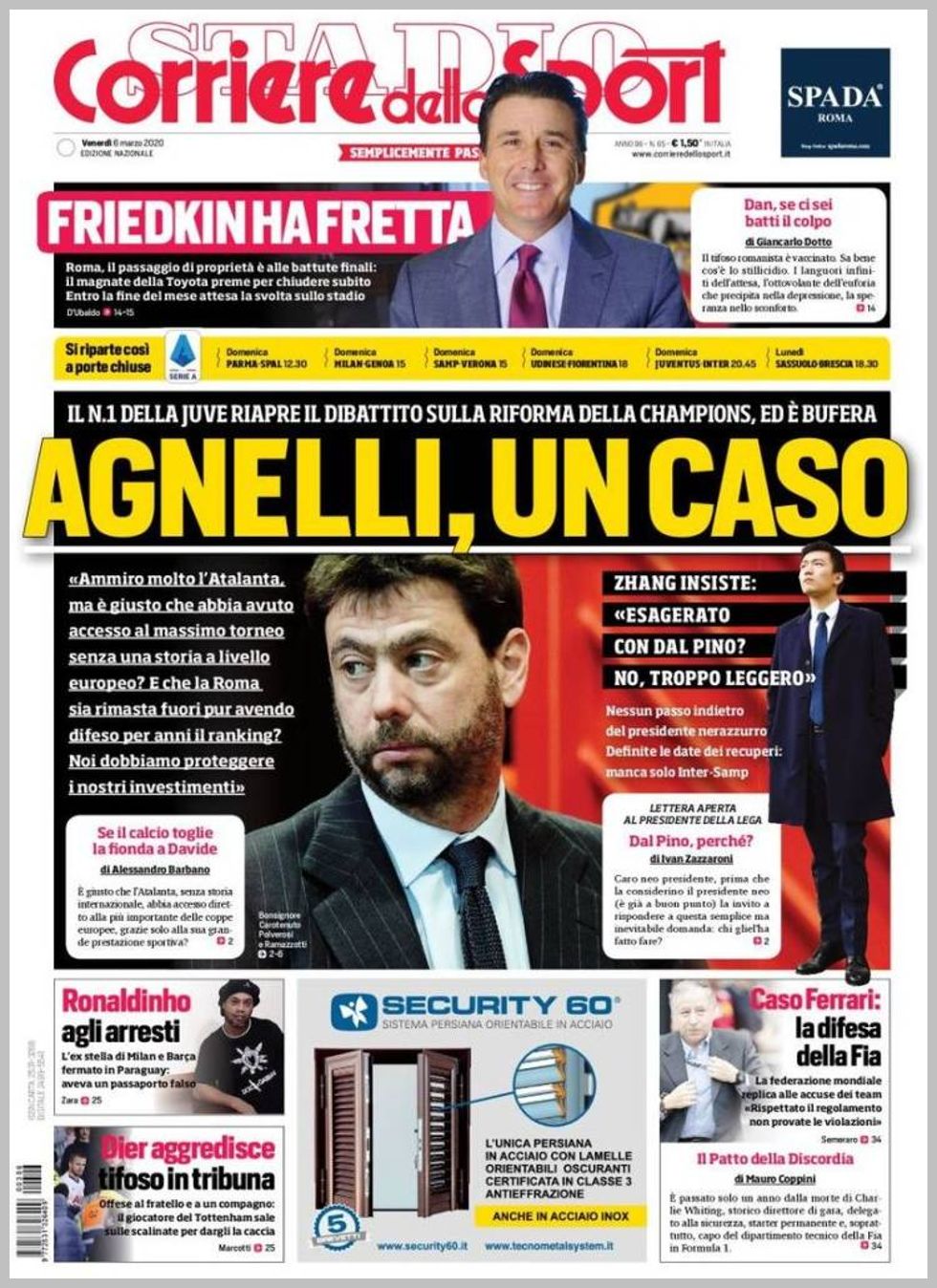 Ακόμα στην Ιταλία βλέπουμε ως πρώτο θέμα στις αθλητικές εφημερίδες, τις τελευταίες δηλώσεις του Ανιέλι που θα συζητηθούν.
