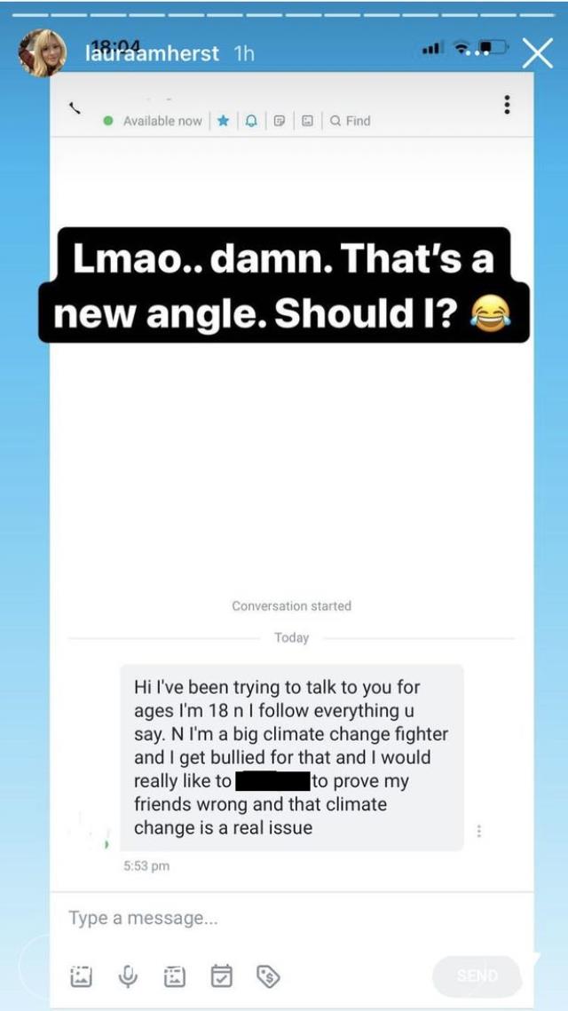 Η Λάουρα ζήτησε βοήθεια κοινοποιώντας το μήνυμα του 18ρονου, το οποίο έλαβε στο λογαριασμό της στο Instagram. Στα όσα έγραφε ο 18χρονος ισχυρίζονταν πως είναι υπέρμαχος της φιλοσοφίας της και ότι θέλει να συμβάλλει και εκείνος στην καταπολέμηση της κλιματικής αλλαγής!!