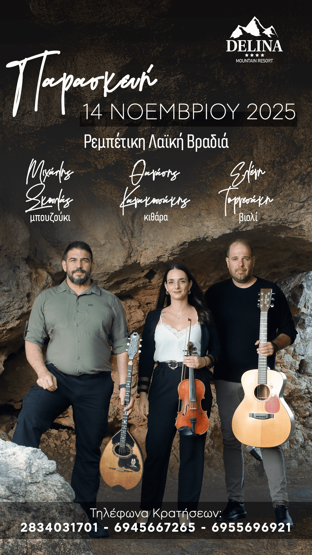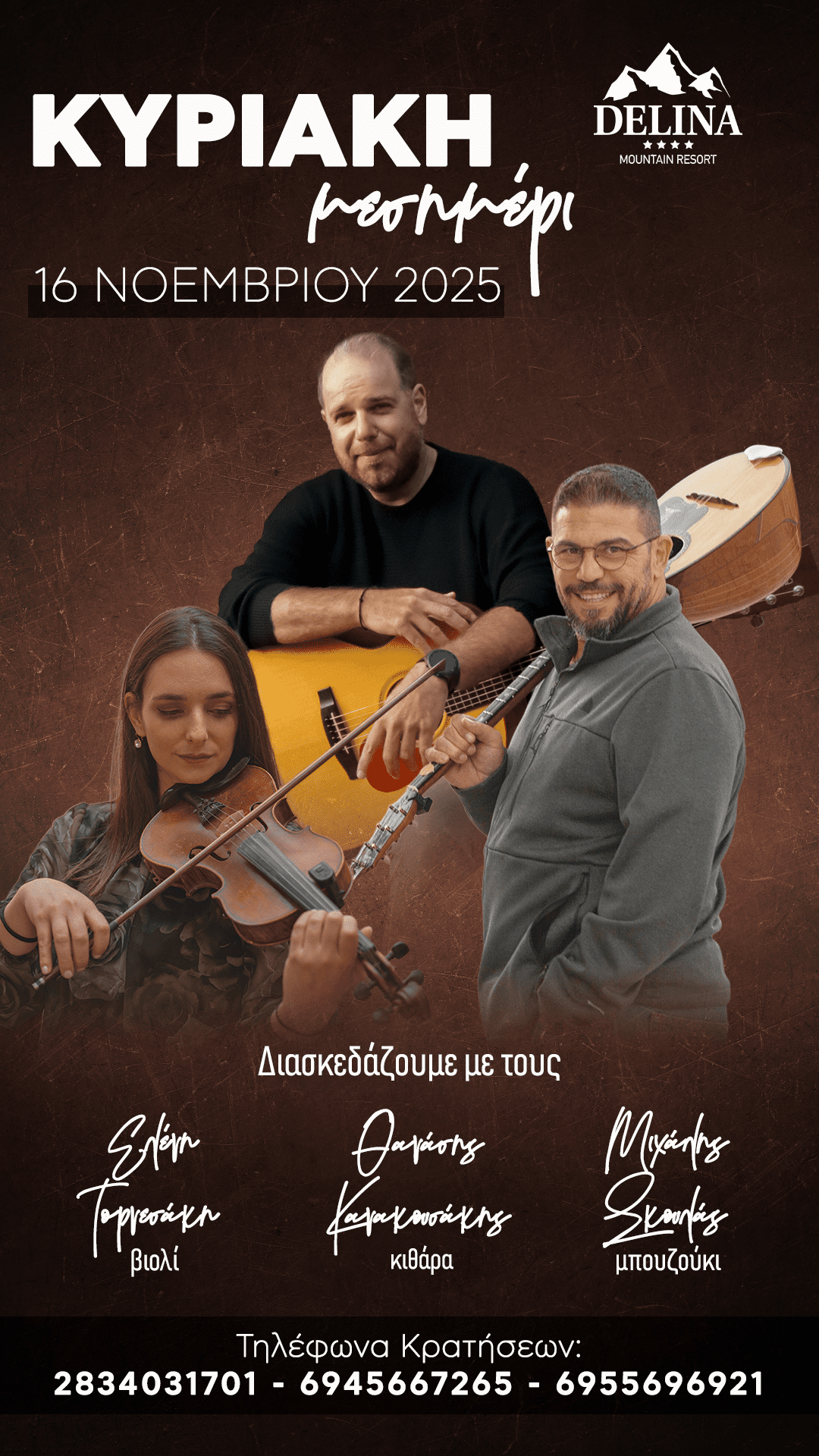 Η παραπάνω καλλιτεχνική ομάδα θα εμφανιστεί στη «Ντελίνα» και το μεσημέρι της Κυριακής 16 Νοεμβρίου σε ένα πολυσυλλεκτικό πρόγραμμα με διαμάντια του ελληνικού τραγουδιού.