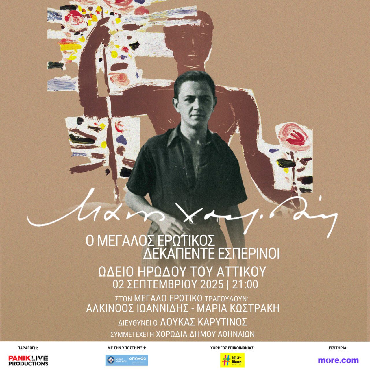 Ο Μεγάλος Ερωτικός και οι Δεκαπέντε Εσπερινοί, δύο εμβληματικά έργα του Μάνου Χατζιδάκι, παρουσιάζονται σε μία μοναδική βραδιά στο Ωδείο Ηρώδου Αττικού, την Τρίτη 2 Σεπτεμβρίου. στις 21:00.