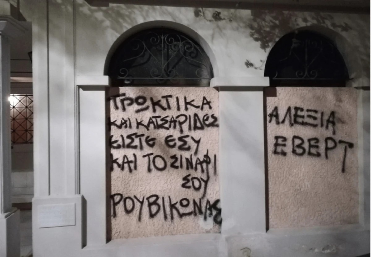 Αλεξία Έβερτ: Η αναρχική συλλογικότητα «Ρουβίκωνας» έγραψε συνθήματα στο σπίτι της πρώην αντιδημάρχου Αθηναίων, έπειτα από το σχόλιο για τους διαδηλωτές του ΚΚΕ που τίμησαν την επέτειο του Πολυτεχνείου.
