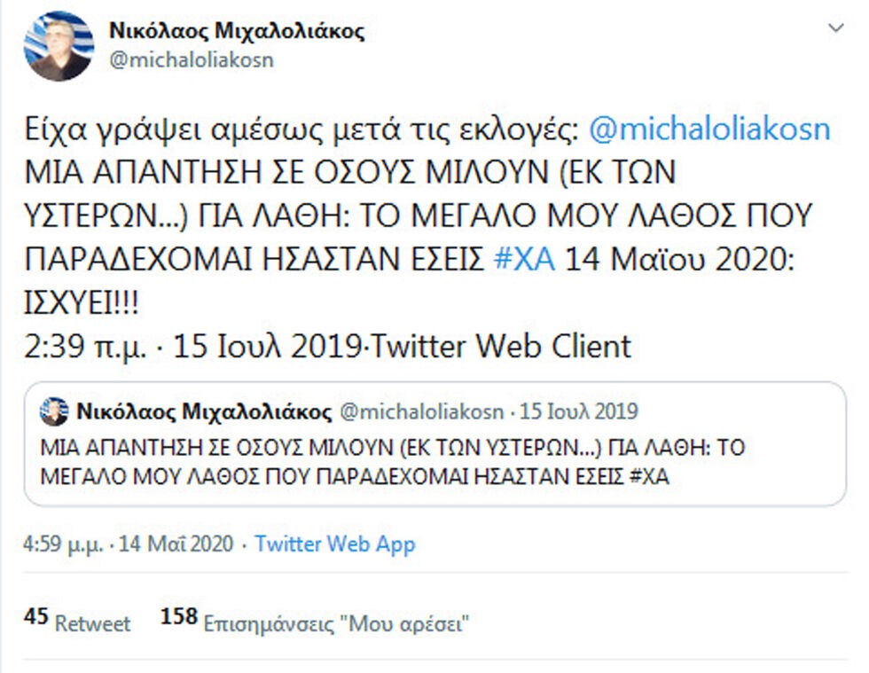 Απλώς ο Μιχαλολιάκος φρόντισε να στείλει το μήνυμα στους μυημένους της οργάνωσής του μέσω twitter.
