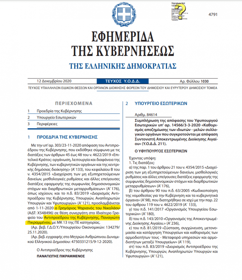 Τώρα, όπως έγινε γνωστό απο ΦΕΚ, διορίστηκε ως συνεργάτης στο γραφείου του αντιπροέδρου της Κυβέρνησης, κ. Παναγιώτη Πικραμμένου, ώστε να προσφέρει εκεί πολιτικό έργο, στην Ελληνική Κυβέρνηση του Κυριάκου Μητσοτάκη και στο Μέγαρο Μαξίμου.