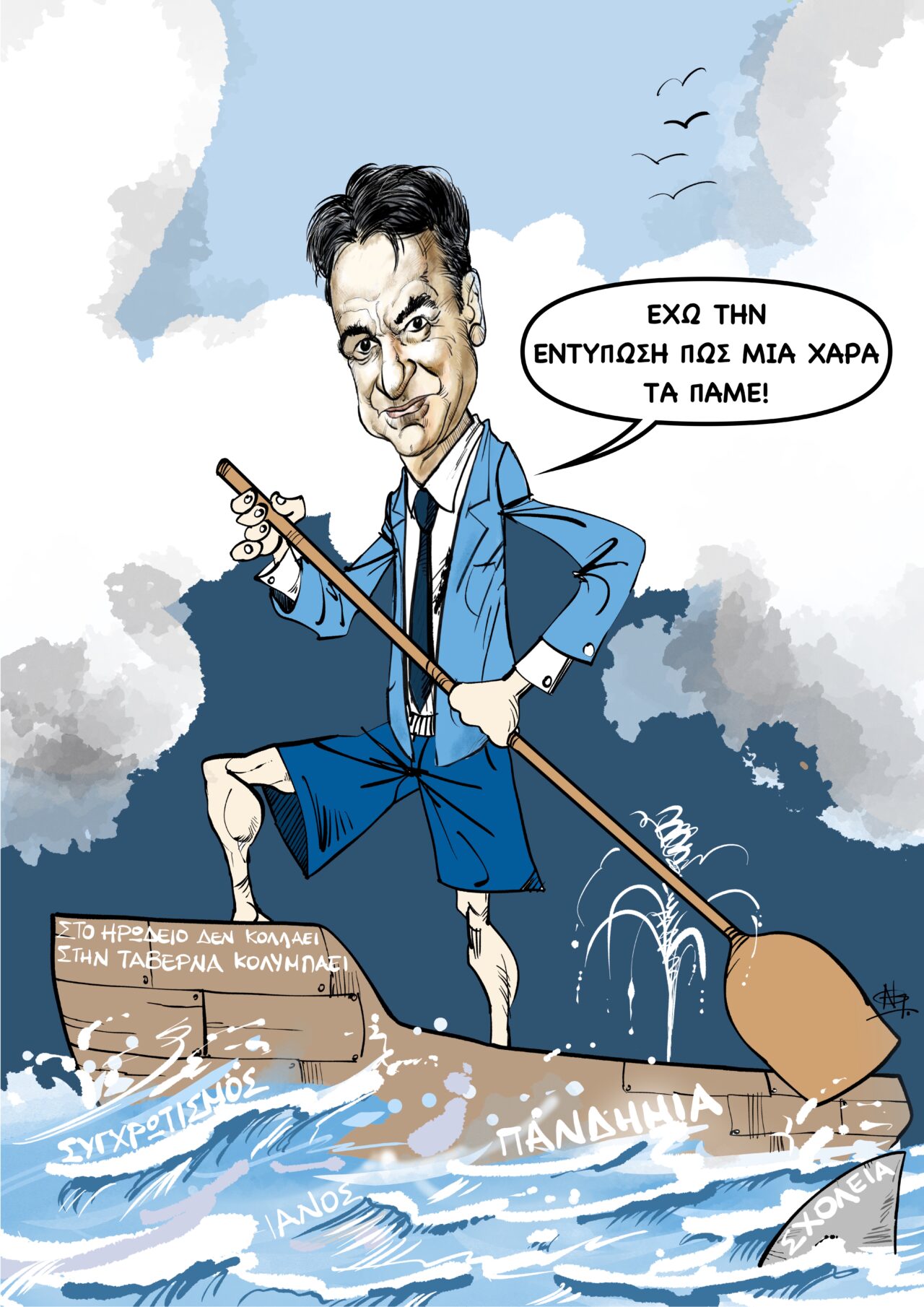 Πηγή έμπνευσης του καλλιτέχνη για το σκίτσο είναι η κατάσταση που επικρατεί στην Ελλάδα, μετά το… χτύπημα του Ιανού.