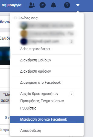 Από το αναπτυσσόμενο μενού που θα σας εμφανίσει, επιλέξτε «Μετάβαση στο Νέο Facebook» που βρίσκεται μεταξύ των Ρυθμίσεων και της Αποσύνδεσης.