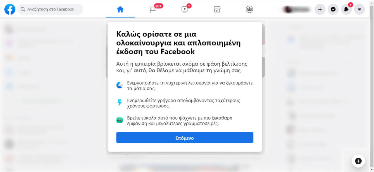 Οι βασικές ενέργειες και λειτουργίες αυτού του νέου σχεδιασμού παραμένουν πρακτικά οι ίδιες με τον συνηθισμένο τρόπο εμφάνισης, αλλά με κάποιες προφανείς αισθητικές αλλαγές, εμπνευσμένες από την εφαρμογή για κινητά. Θα βρείτε το πλαίσιο αναζήτησης στην επάνω αριστερή γωνία ενώ στα δεξιά τα κουμπιά για πρόσβαση στο προφίλ σας, αποστολή μηνυμάτων, προβολή ειδοποιήσεων και διαμόρφωση του λογαριασμού σας. Υπάρχουν 5 μεγάλες ενότητες στο κέντρο: η τροφοδοσία ειδήσεων στην αρχική σας σελίδα, το Facebook Watch, το Facebook MarketPlace, οι ομάδες και τέλος το Facebook Gaming.