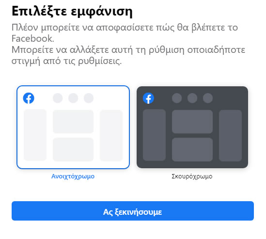 Στο επόμενο παράθυρο, θα έχετε μια επιλογή ανάμεσα στο κλασικό Light ή τη νέα Dark έκδοση. Επιλέξτε ποια προτιμάτε και επιβεβαιώστε κάνοντας κλικ στο «Ας ξεκινήσουμε» .