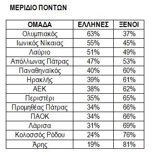 Όπως μπορείτε να δείτε στον πίνακα που ακολουθεί, ο Ολυμπιακός και ο Ιωνικός Νίκαιας πήραν πολύ μεγάλο μερίδιο πόντων από τους Έλληνες παίκτες τους. Οι Πειραιώτες στο 63% (σχεδόν τα 2/3) και οι Νικαιώτες πάνω από τους μισούς. Πολύ καλοί αριθμοί και για το Λαύριο όπως και για τον Απόλλωνα Πάτρας αλλά πολύ άσχημοι (για τους Έλληνες) στον Κολοσσό και τον Άρη.