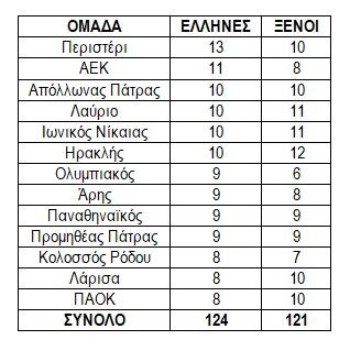 Ο πρώτος πίνακας έχει να κάνει με τον αριθμό των ξένων και την Ελλήνων παικτών που χρησιμοποιήθηκαν στην Basket League. Από τους 124 Έλληνες, πάντως, πρέπει να αφαιρέσετε έξι που αγωνίστηκαν σε δύο ομάδες μέσα στη σεζόν. Άρα οι ξένοι αυτόματα γίνονται περισσότεροι.