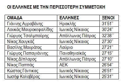 Όπως μπορείτε να δείτε στον πίνακα που ακολουθεί, ο Ολυμπιακός και ο Ιωνικός Νίκαιας πήραν πολύ μεγάλο μερίδιο πόντων από τους Έλληνες παίκτες τους. Οι Πειραιώτες στο 63% (σχεδόν τα 2/3) και οι Νικαιώτες πάνω από τους μισούς. Πολύ καλοί αριθμοί και για το Λαύριο όπως και για τον Απόλλωνα Πάτρας αλλά πολύ άσχημοι (για τους Έλληνες) στον Κολοσσό και τον Άρη.