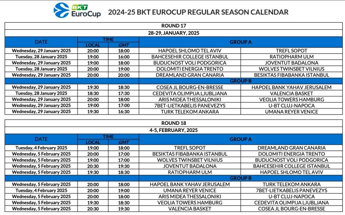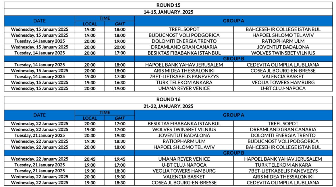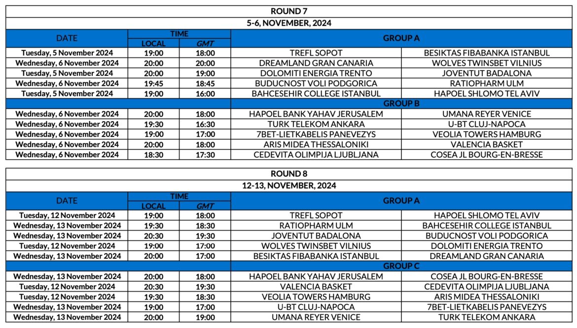 Σημειώνεται ότι σε σχέση με το αρχικό πρόγραμμα, υπήρξε ανταλλαγή έδρας με την Κλουζ Ναπόκα (9η και 18η αγωνιστική), λόγω μη διαθεσιμότητας του γηπέδου της ρουμανικής ομάδας στην αυλαία της κανονικής περιόδου. Συνεπώς, ο Άρης θα αγωνιστεί με την Κλουζ Ναπόκα στη Ρουμανία στο τέλος του πρώτου γύρου και στο «Nick Galis Hall» στην τελευταία αγωνιστική της regular season.