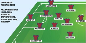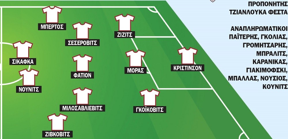Τις τελικές του δοκιμές χθες έκανε ο Ακης Μάντζιος, αλλά χωρίς να υπολογίζει σε αρκετούς βασικούς ποδοσφαιριστές. Εκτός μάχης τέθηκαν οι τραυματίας Κούρντι, Καμαρά, Κότνικ και οι Μανοΐλοβιτς, Μπανανά, Κότσιτς, Σιντί Αλί. Ο Σπιριντόνοβιτς συμπεριλήφθηκε στη 18άδα και ανάλογα με την εξέλιξη του αγώνα θα φανεί αν θα αγωνιστεί, ενώ θέση στην αρχική ενδεκάδα αναμένεται να επιστρέψει μετά από καιρό ο Σαραμαντάς.