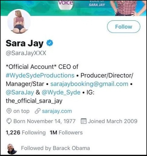 Ο πρώην πρόεδρος των ΗΠΑ, Μπάρακ Ομπάμα, έριξε... δίχτυα στην Αμερικανίδα πορνοστάρ Σάρα Τζέι, μιας και την ακολούθησε στο twitter!