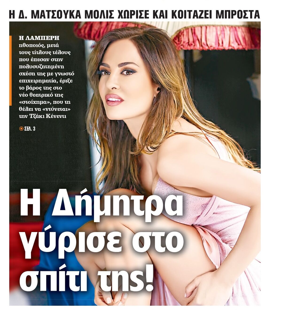 «Η Δήμητρα γύρισε στο σπίτι της! Η Δήμητρα Ματσούκα μόλις χώρισε και κοιτάζει μπροστά. Η λαμπερή ηθοποιός, μετά τους τίτλους τέλους που έπεσαν στην πολυσυζητημένη σχέση της µε γνωστό επιχειρηματία, έριξε το βάρος της στο νέο θεατρικό της «στοίχημα», που τη θέλει να «ντύνεται» την Τζάκι Κένεντι», αναφέρει το δημοσίευμα της εφημερίδας.