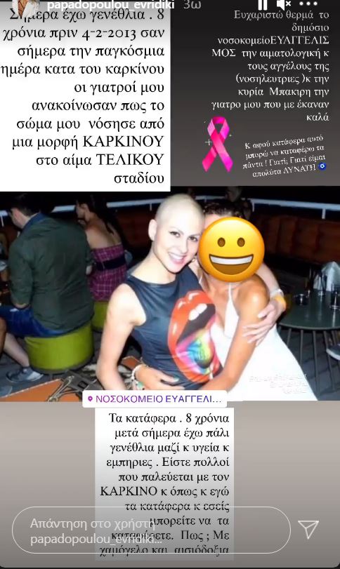 «Σήμερα έχω γενέθλια. 8 χρόνια πριν 4-2-2013 σαν σήμερα παγκόσμια ημέρα κατά του καρκίνου, οι γιατροί μου ανακοίνωσαν πως το σώμα μου νόσησε από μια μορφή καρκίνου στο αίμα τελικού σταδίου. Τα κατάφερα. 8 χρόνια μετά σήμερα έχω πάλι γενέθλια κ υγεία κ εμπειρίες. Είστε πολλοί που παλεύετε με τον καρκίνο και όπως και εγώ τα κατάφερα και εσείς μπορείτε να τα καταφέρετε. Πως; Με χαμόγελο και αισιοδοξία. Και αφού κατάφερα αυτό, μπορώ να καταφέρω τα πάντα. Γιατί; Γιατί είμαι απόλυτα δυνατή.», έγραψε χαρακτηριστικά η Ευρυδίκη Παπαδοπούλου.