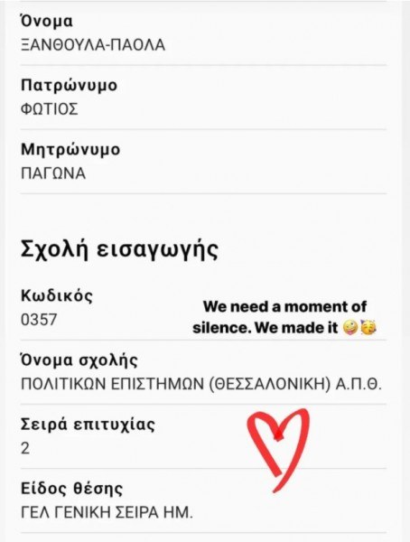 Η 18χρονη ανάρτησε το αποτέλεσμα της επιτυχίας της στο Instagram και όπως αποκάλυψε, πέρασε δεύτερη στην σχολή Πολιτικών Επιστημών στην Θεσσαλονίκη.