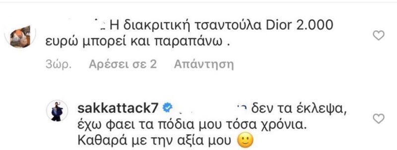 Η Σάκκαρη με το που είδε το σχόλιο της κοπέλας πέρασε στην… επίθεση, γράφοντας της την αλήθεια: «Δεν τα έκλεψα. Έχω φάει τα πόδια μου τόσα χρόνια. Καθαρά με την αξία μου».